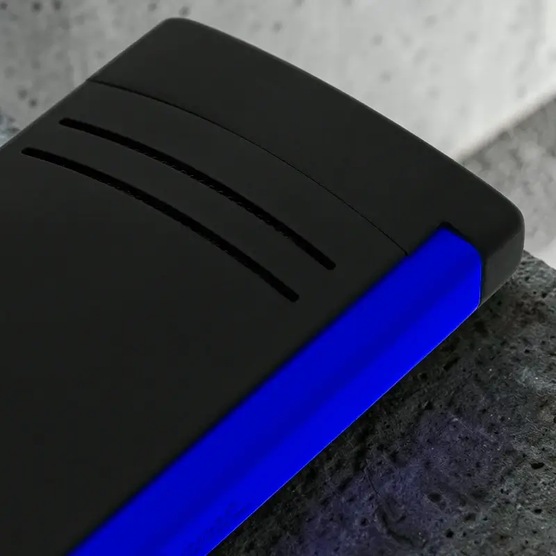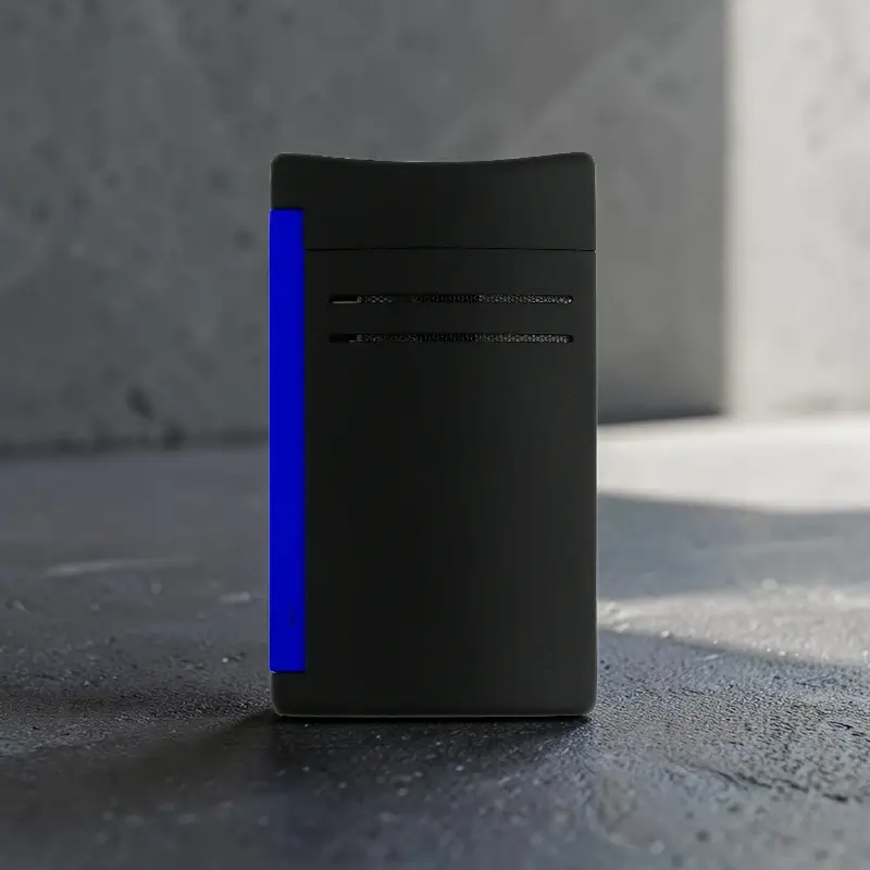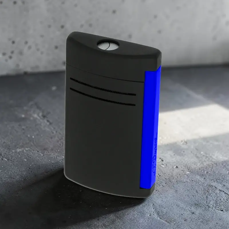 Fluo plava boja daje sportski i savremen izgled upaljaču, dok lakirana završna obrada (varnish) doprinosi elegantnom vizuelnom utisku. Kompaktno kućište upaljača čini ga praktičnim za nošenje u džepu ili futroli za cigare.