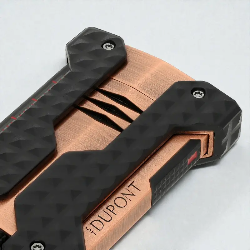 Kućište u copper (bakarnom) tonu, sa zaštitnim crnim gumiranim elementima i prepoznatljivim Dupont guilloché uzorkom, obezbeđuje izdržljivost, siguran hvat i upečatljiv vizuelni identitet. Konstrukcija je osmišljena da izdrži udarce, vetar i intenzivnu upotrebu, bez kompromisa po pitanju estetike.